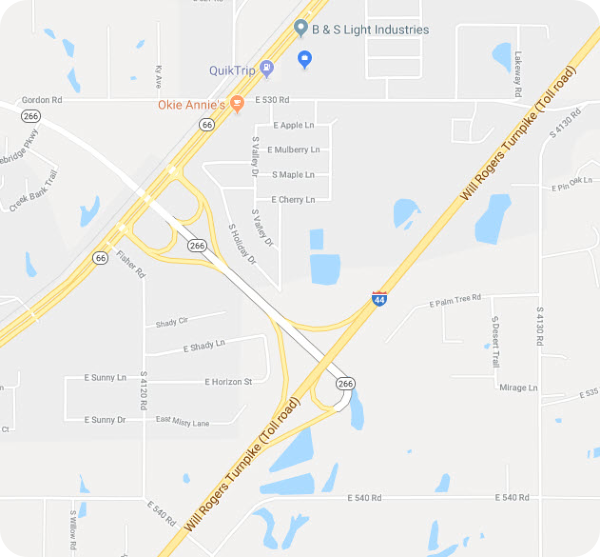 We are located outside of Tulsa, OK on Hwy 66 between Verdigris and Claremore.